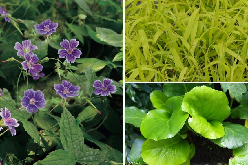 Une idée d’association : Geranium nodosum ‘Clos du Coudray’, Millium effusum ‘Aureum’, Bergenia ‘Morgenrote’
