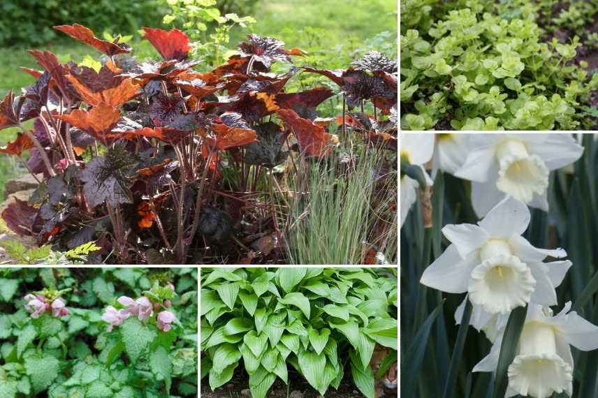 Une idée d’association : Heuchera ‘Palace Purple’, Lysimachia nummularia ‘Aurea’, Narcissus ‘Mount Hood’, Hosta ‘Sweet Susan’, Lamium maculatum ‘Pink Pewter’