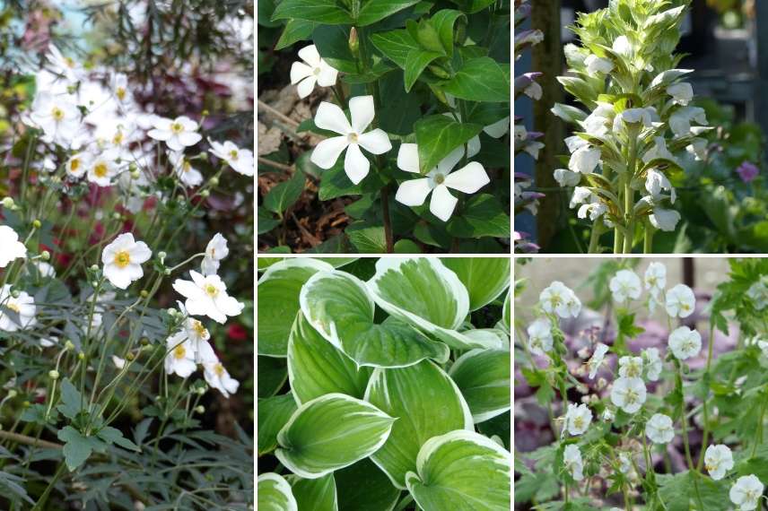 Une idée d’association : Anemone ‘Honorine Jobert’, Vinca major ‘Alba’, Acanthus mollis ‘Rue Ledan’, Hosta ‘Clifford’s Forest Fire’, Geranium phaeum ‘Album’