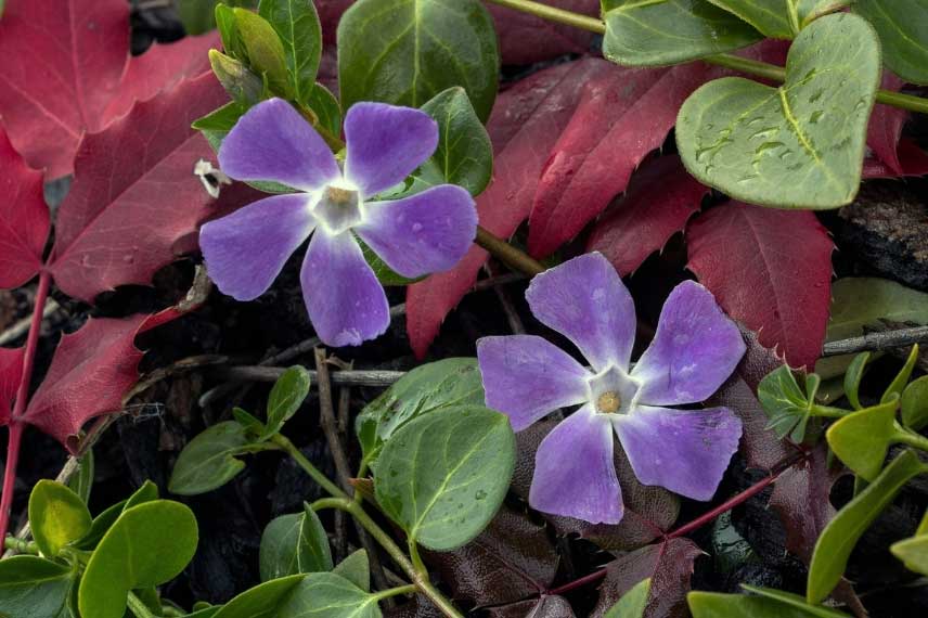 Les pervenches apprécient l’ombre ou la mi-ombre, surtout en sol frais, humifère et bien drainé. Elles supportent aussi les sols secs une fois bien établies, ce qui en fait de parfaites plantes pour massif d’ombre extérieur, notamment en situation difficile.