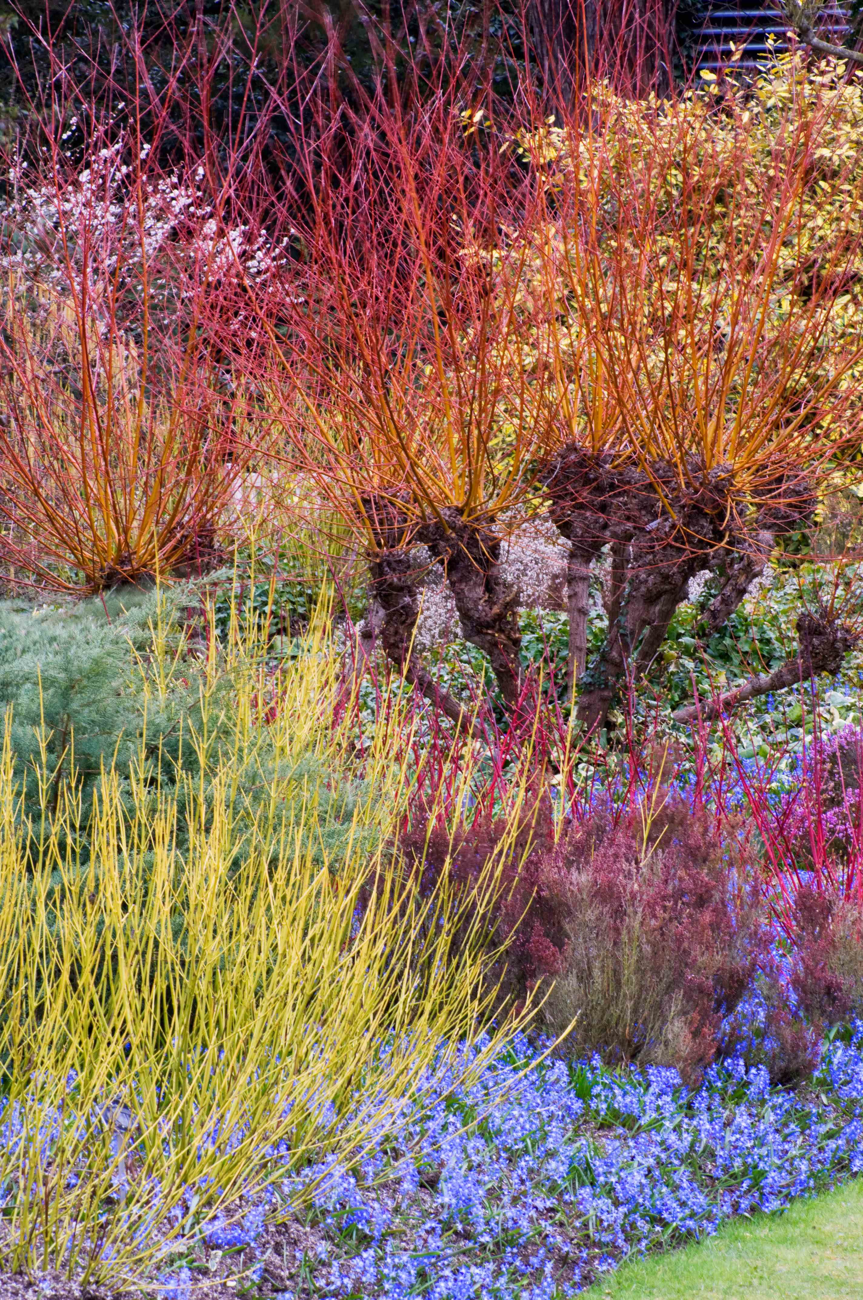 En premier plan de ce massif d’hiver, le bois doré du Cornus stolonifera Flaviramea contraste avec les fleurs bleues des Chionodoxa luciliae en bordure. En second plan, le bois orangé du saule des vanniers (Salix viminalis) illumine le massif grace aux feuilles panaché et persistant de l’Elaeagnus ‘Limelight’