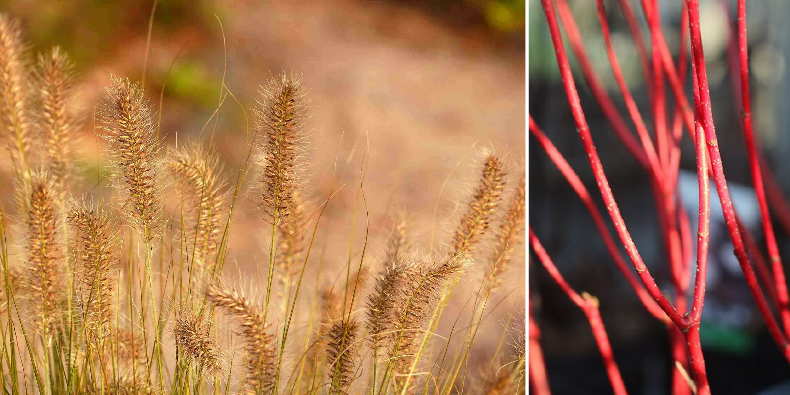 Vous pouvez adopter un ton très contemporain grâce aux lignes sages mais très nerveuses des cornouillers à bois décoratifs. En massif, la compagnie de graminées en abondance apportera un souffle de modernité, de légèreté et beaucoup de souplesse aux lignes bien droites des cornouillers. Pour une belle scène d’hiver contemporaine, les tiges rouge vif seront spectaculaires en association avec les reflets blonds de l’herbe-aux-écouvillons ou l’herbe de la pampa, avec les grandes inflorescences légères or et argent de canches cespiteuses ou avec les touffes brun cuivré d’un Carex. Avec leurs formes souples, les graminées forment des écrans très « nature », en arrière-plan de massif, elles serviront de lien et de faire-valoir aux rameaux vivement colorés des cornus.