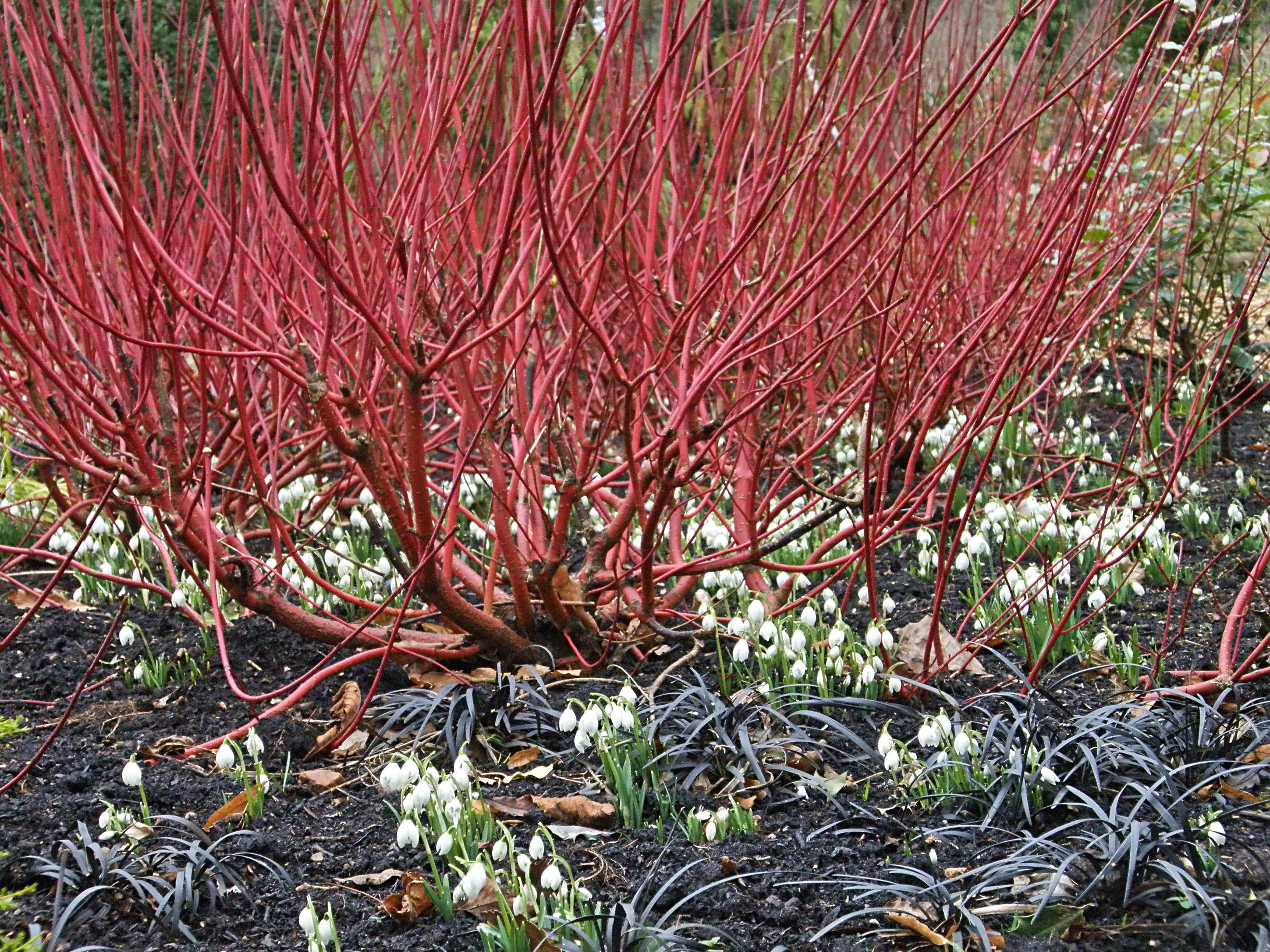 Ils y offrent un attrait échelonné tout au long de l’année. Au printemps avec nombre de petits bulbes fleurissant très tôt en saison (crocus, narcisses, perce-neige, tulipes botaniques), puis avec des vivaces variées auxquels leur feuillage bien vert ou panaché de blanc devenant flamboyant servira d’écrin. Pour une belle scène d’hiver, plantez les cornus avec des Chrysanthèmes d’automne, des Hellébores et avec une multitude de bruyères des neiges blanches, rose pourpré ou rose liliacé. Elles composeront un tapis sur lequel se détacheront les rameaux vivement colorées d’un Cornus alba ‘Sibirica’. Les formes dénudées et dressées des cornouillers introduiront une ponctuation éclatante qui rompra l’uniformité des bruyères.