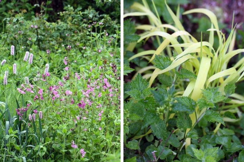 A gauche : Persicaria bistorta et Silene dioïca (compagnon rouge) – A droite : Millium effusum ‘Aureum’ et Lamium galeobdolon (ortie jaune)