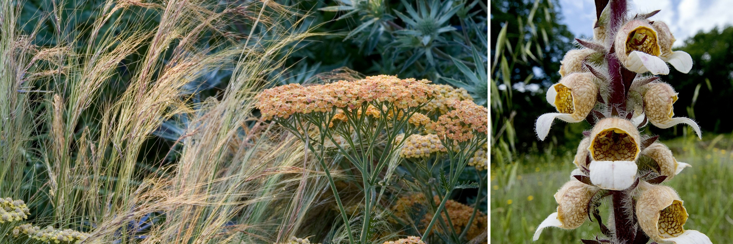 On mise sur la vivacité des coloris d’un œillet deltoïdes ‘Flashing Light’ ou d’un œillet Mignardise ‘Romeo’ pour donner de la chaleur à une joyeuse bordure estivale. Dans un esprit joyeux et sauvageon, on y mêle des Phlox, des graminées de petites tailles (Carex, Stipa tenuifolia), des Digitales, de Tabacs ornementaux, des Echinacées ou des Chardons boule.