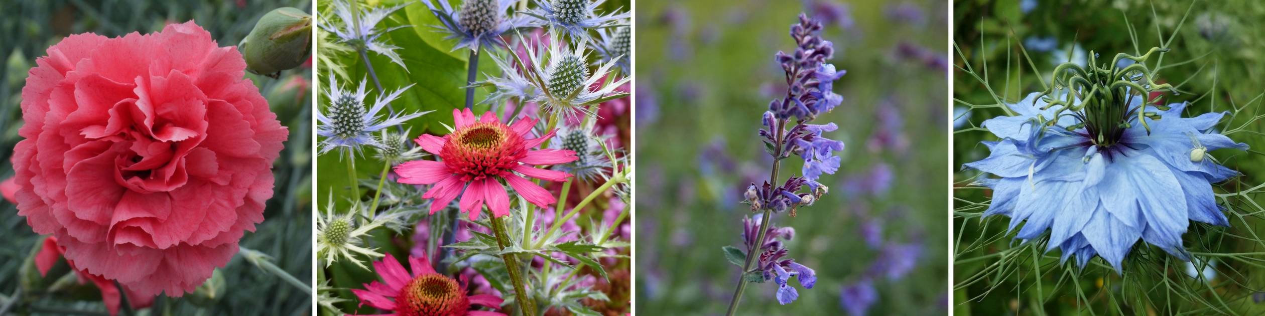 En massif, plantez les œillets en groupe, au premier plan, avec des Sedum, des Achillées et des Echinacées, pour réaliser de belles masses de couleur. Entourés d’Ancolies, d’Asters, de Campanules, de Nepetas, de Scabieuses, Coreopsis, Gaillardes naines, Cléomes, Nigelles, ils composeront des scènes d’aspect sauvage et hautes en couleur.