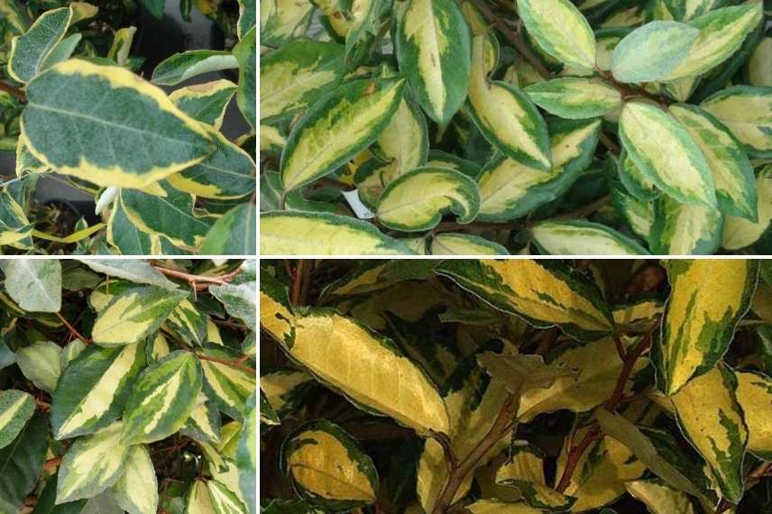 En haut à gauche : Eleagnus ebbingei ‘Gilt Edge’ ; en bas à gauche : Eleagnus pungens ‘Maculata’ ; en haut à droite : Eleagnus ebbingei ‘Limelight’ ; en bas à droite : Eleagnus ebbingei ‘Eleador’