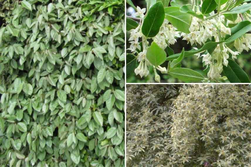 Eleagnus Ebbingei et Eleagnus umbellata en haut à droite, au feuillage vert, et Eleagnus commutata ‘Zempin’ aux feuilles argentées