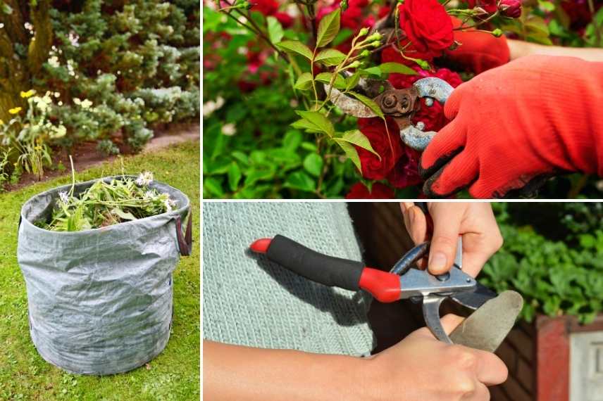 Sac à déchets verts, gants spécial rosiers et affutoir pour les lames de sécateurs sont indispensables