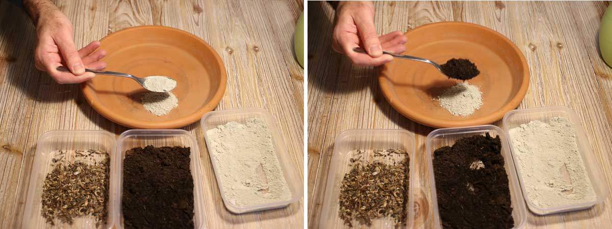 - Commencer par remplir un récipient avec, approximativement, 2 volumes d’argile en poudre pour 1 volume de terreau.