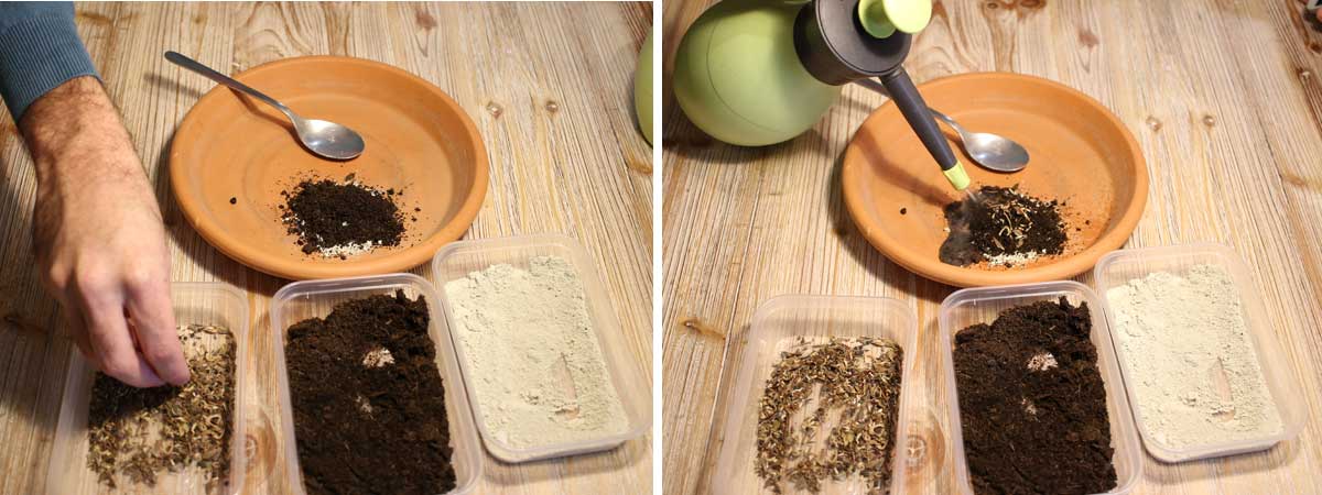 - Ajoutez quelques graines au mélange puis ajoutez un peu d’eau. Allez-y doucement : il est préférable de mettre peu d’eau et d’en rajouter si besoin.
