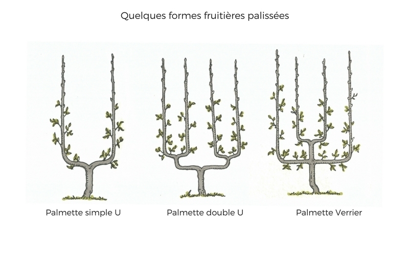 - la palmette en U (simple ou double) et la palmette Verrier : Le U simple est constitué par deux charpentières verticales issues du scion, reprenant la forme du U, distantes de 30 cm et hautes de 2,50 m environ. Il est également possible de former un U double (deux U côte-à-côte) ou une palmette Verrier (de petit(s) U dans un grand U).