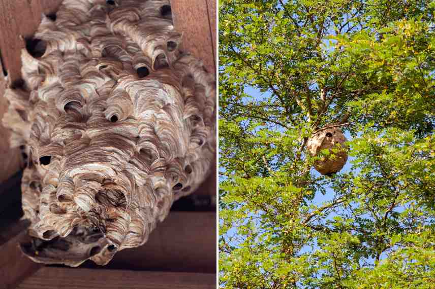 À gauche, un nid de frelons européens sous un toit, à droite un nid de frelons asiatiques dans un arbre