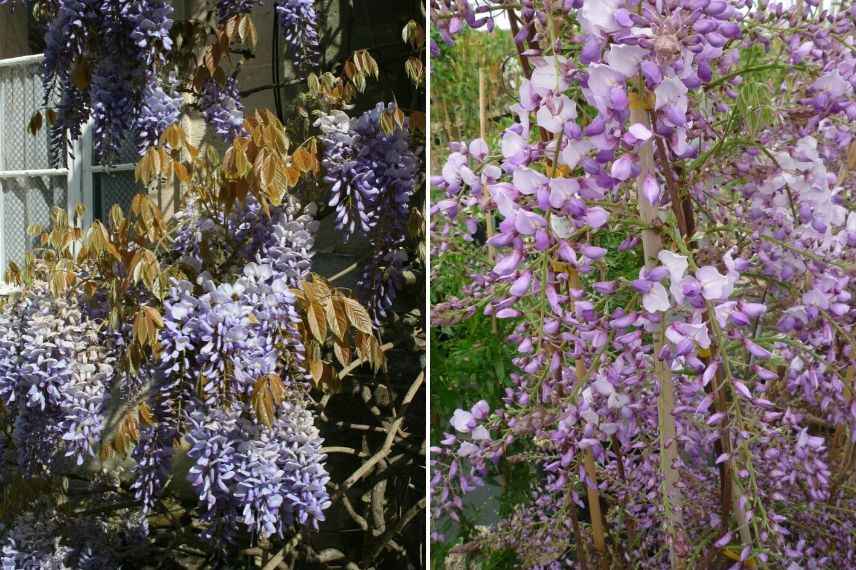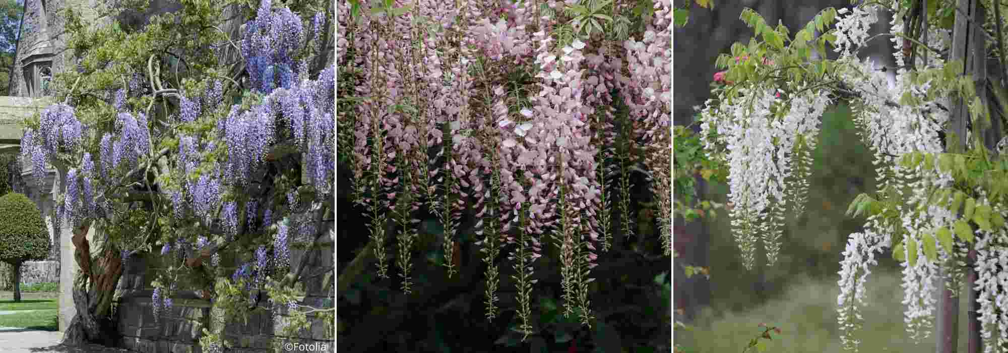 Selon la couleur des fleurs : Wisteria floribunda, Wisteria floribunda ‘Rosea’ et Wisteria floribunda ‘Alba’