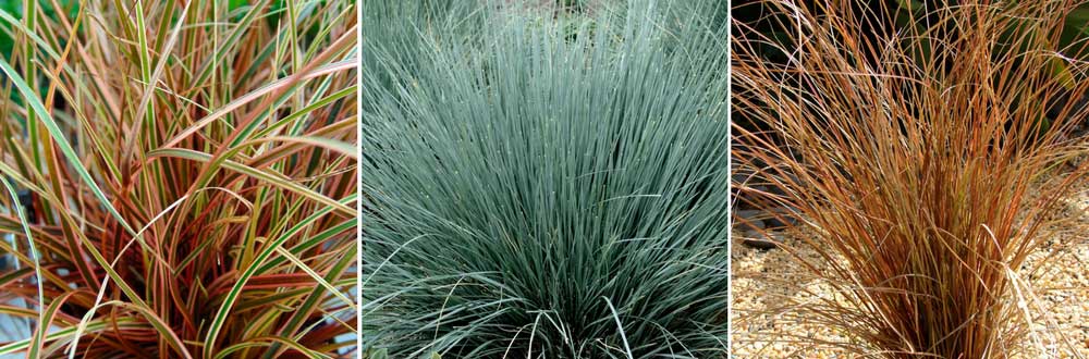 Les graminées persistantes offrent un superbe spectacle durant toute l’année. Elles demandent très peu d’entretien et n’ont pas besoin d’être taillées ! Deschampsia cespitosa est une remarquable graminée qui possède de jolies panicules dressées, d’abord verts puis dorés. Découvrez aussi Uncinia rubra, une graminée surprenante qui forme des touffes d’un rouge éclatant ! Elle apprécie les sols frais ou humides. En terrain un peu plus sec, profitez des teintes chaudes des carex de Nouvelle-Zélande (Carex buchananii et Carex comans). Les stipa forment de petites touffes, dont le feuillage très fin semble jouer avec le vent ! Choisissez Stipa tenuifolia ou Stipa pennata. Découvrez aussi Helictotrichon sempervirens, l’avoine bleue, qui forme de belles touffes bleues – grises. Pour un bleu plus prononcé, nous vous conseillons plutôt Festuca ‘Elijah Blue’.