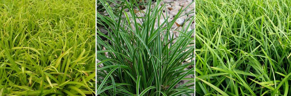 De gauche à droite: Luzula sylvatica ‘Solar Flare’ (photo Guido), Carex morrowii ‘Ice Dance’ et Carex morrowii ‘Irish Green’