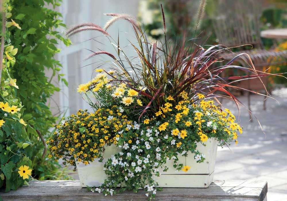 Pennisetum, Sanvitalia ‘Aztekengold’, Anthemis ‘Butterfly’; Bacopa et Bidens (Photo: Biosphoto / Friedrich Strauss )