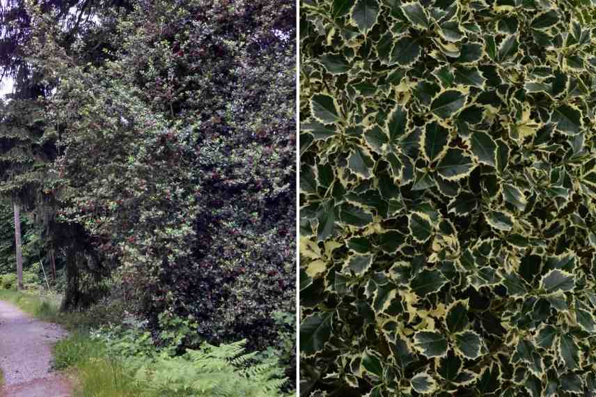 Le houx commun forme de très belles haies qui ses couvrent de baies tout l’hiver (Photo : J. Brew). A droite Ilex aquifolium ‘Argenteomarginata’