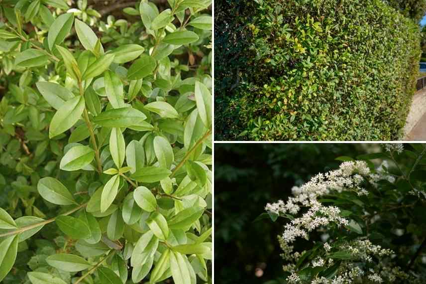 Le feuillage du troène ‘Atrovirens’ à gauche ; une haie de troène et sa floraison si non taillé, à droite