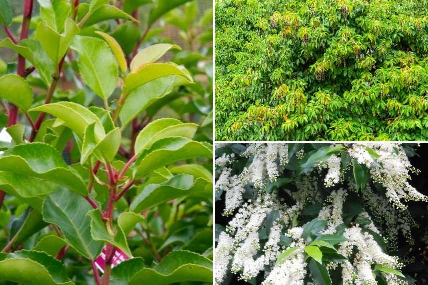 Prunus lusitanica ‘Brenelia’ à gauche ; port en haie d’un Laurier du Portugal et sa floraison blanche éclatante à droite
