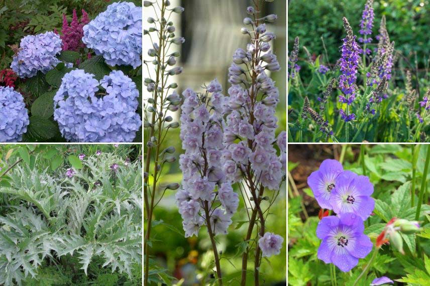 Avec leur floraison généreuse, aux teintes souvent pastel, et leur feuillage ample, les hortensias s’intègrent facilement dans les jardins de cottage. Ce type de jardin anglais vous ravira par son côté frais et verdoyant ! Il offre une profusion de fleurs et de feuillages, et il est idéal notamment pour mettre en valeur une vieille maison en pierre ou une maison à colombages. Nous vous conseillons de choisir une variété à fleurs bleues, comme l’hortensia macrophylla ‘Nikko Blue’. Plantez à ses côtés des géraniums vivaces, delphiniums, campanules, du népéta, des sauges… Découvrez l’Achillea ptarmica ‘The Pearl’, dont les fleurs blanches et doubles forment de petites boules semblables à des pompons. Privilégiez les plantes aux feuillages exubérants : Cynara cardunculus, Petasites, Melianthus, Acanthes… et faites dépasser leurs feuilles des massifs, pour créer un sentiment d’abondance végétale, de foisonnement. Votre jardin aura ainsi un aspect très vivant ! Pensez aussi aux Delphiniums, qui offrent de longues hampes florales dressées : découvrez notamment la variété ‘Highlander Cha Cha’, qui porte des fleurs doubles, rassemblant un grand nombre de pétales, de couleur mauve – lilas. Sa floraison est incroyablement douce et romantique ! Vous pouvez installer à ses côtés le splendide Polemonium caeruleum ! Il possède un gracieux feuillage découpé, d’un beau vert, ainsi que de petites fleurs bleues ou blanches suivant les variétés. N’hésitez pas à installer sur l’avant du massif des géraniums vivaces, comme la variété ‘Rozanne’. Ils accompagneront parfaitement la floraison de la sauge Salvia nemorosa. Vous pouvez intégrer quelques plantes potagères et aromatiques dans vos massifs, car le jardin de cottage est également un jardin utilitaire !