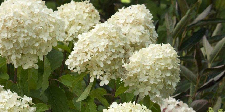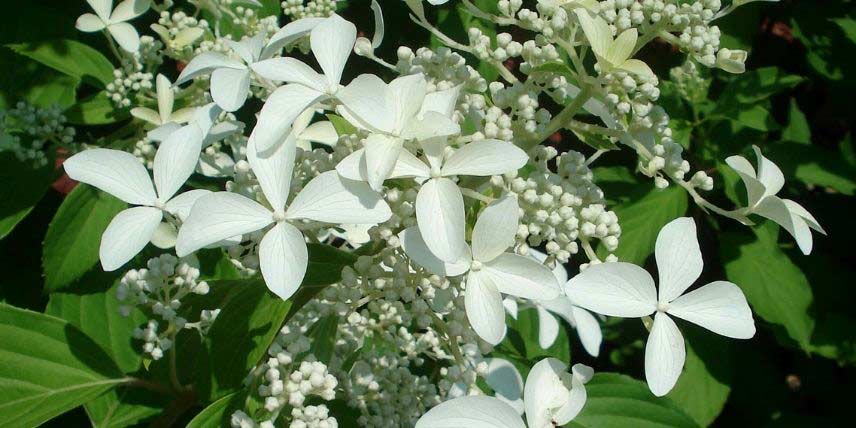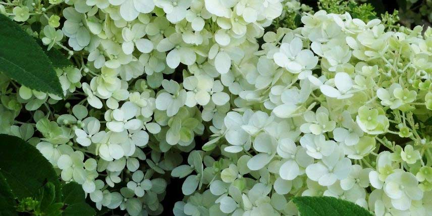 Les hortensias, ou Hydrangea, sont des arbustes qui offrent une floraison de longue durée, souvent entre juin et septembre, sous forme d’inflorescences sphériques, aplaties ou en panicules. Leur floraison est souvent très impressionnante et généreuse. Ils constituent un groupe diversifié, rassemblant de nombreuses espèces et variétés qui offrent des formes de floraisons différentes entre par exemple les Hydrangea macrophylla, les Hydrangea paniculata et les Hydrangea serrata. Certaines variétés sont même grimpantes ! Les fleurs d’hortensia prennent en général des teintes douces : bleu, mauve, rose, blanc… Les variétés à fleurs blanches sont particulièrement élégantes et gracieuses. Ces qualités les rendent idéales pour intégrer un jardin romantique ou un jardin moderne, où elles apporteront un côté très chic. Elles permettent de créer du contraste, par exemple aux côtés de plantes aux feuilles sombres ou noires. Les hortensias à fleurs blanches sont très faciles à associer à d’autres floraisons colorées, mais peuvent aussi entrer dans la composition d’un jardin blanc, en compagnie par exemple de gypsophiles, Achillea ptarmica ‘The Pearl’, Clematis ‘Baby Star’ ou Digitalis purpurea ‘Alba’. Ces floraisons blanches auront l’avantage de refléter la lumière et d’illuminer les zones les plus sombres de votre jardin. Découvrez dans cette fiche notre sélection de 7 variétés parmi les plus beaux hortensias à fleurs blanches !