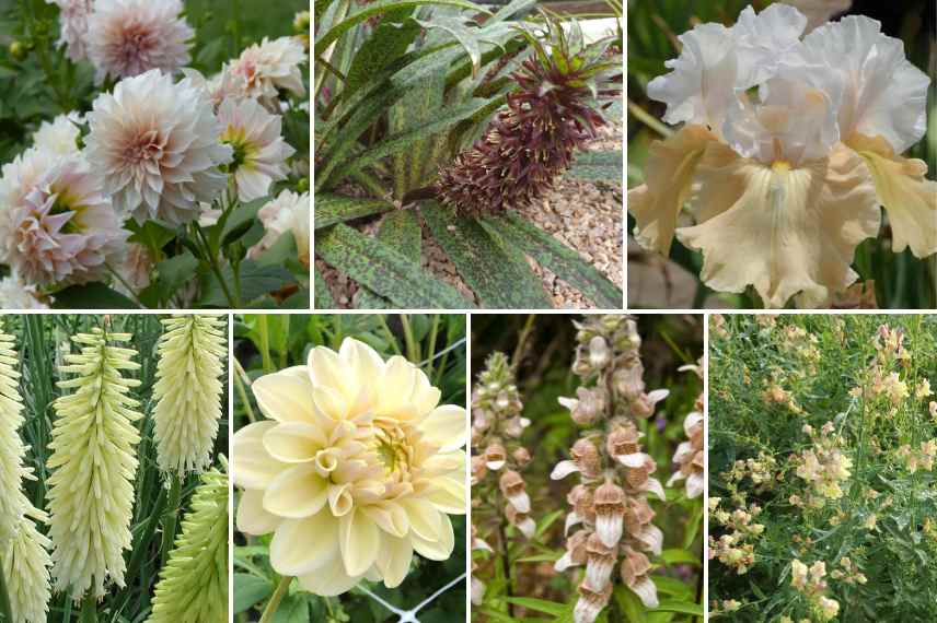 Comme il va fleurir à partir de juillet seulement, entourez-le de quelques vivaces plus précoces comme l’Iris ‘Champagne Frost’ et ses tons chamoisés et la pivoine lactiflora ‘King’s Day’ ou ‘Madame Calot’. Dès juillet, notre Dahlia sera accompagné de floraisons très douces, aux teintes vanillées à saumon clair, comme la benoite ‘Pretticoats Peach’, des Kniphofia ‘Ice Queen’, ainsi qu’une linaire pêche et une digitale laineuse (Digitalis lanata) parfaitement dans les notes café, et poussant aussi haut que le Dahlia.