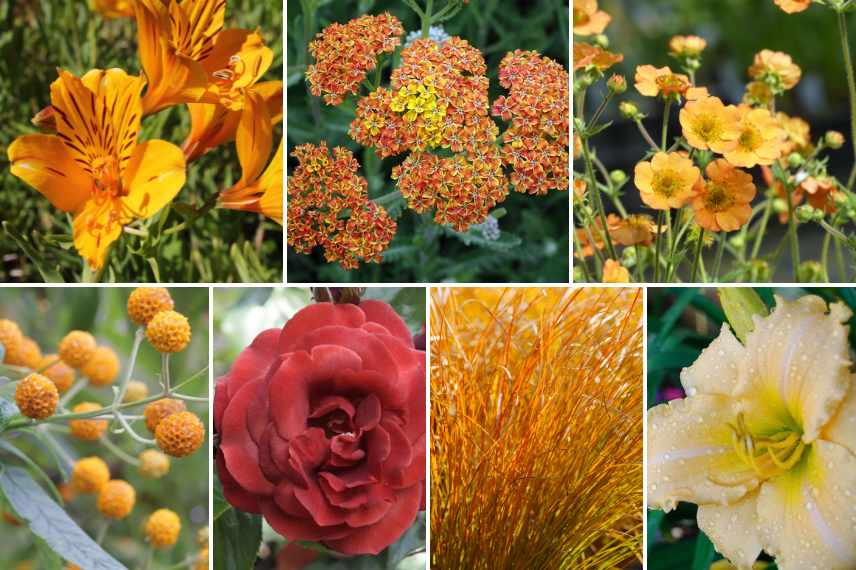 Alstroemeria aurantiaca, Achillea millefolium’Terracotta’, Geum ‘Totally Tangerine,’ Buddleia globosa, rosier ‘Terracotta’, Carex testacea ‘Prairie Fire’, et Hemérocalle ‘Femme Osage’