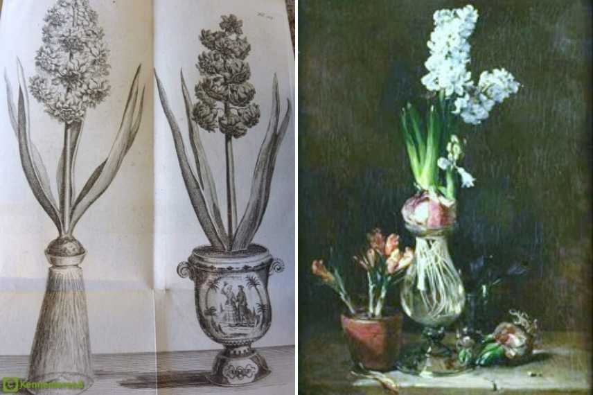 La culture de la jacinthe sur carafe est un procédé qui remonte en réalité au 17ème siècle, à l’époque où les bulbes, notamment les tulipes, connaissent un engouement sans pareil en Europe (la fameuse tulipomania). On retrouve de nombreuses illustrations de forçage sur carafe à jacinthe au 18è siècle, où ce petit vase décoratif permettant de poser le bulbe sur un réservoir d’eau est devenu très tendance. Il est le plus souvent en verre, parfois en céramique ou en cristal, on va même l’industrialiser tant la mode est à ce système de culture des jacinthes.