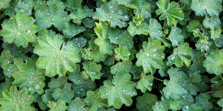 Le feuillage de l'alchémille, retenant les gouttes de pluie ou de rosée