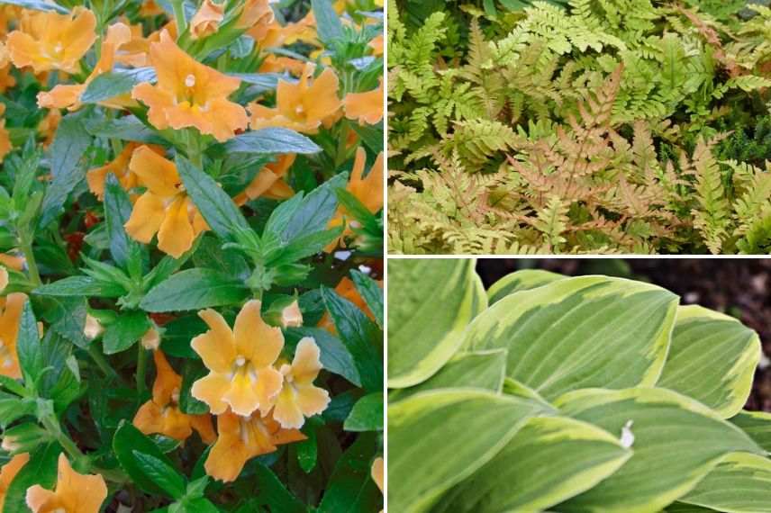 Idée n°1 : Mimulus ‘Burst Orange’ (ou ‘Highland Yellow’ sera très joli aussi), Dryopteris erythrosora et Hosta ‘Fragrant Dream’