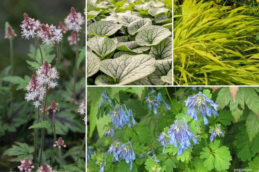 Idée 4 : Tiarella ‘Sugar and Spice’, Brunnera macrophylla ‘Jack Frost’, Hakonechloa macra ‘All Gold’ et Corydalis flexuosa ‘Purple Leaf’