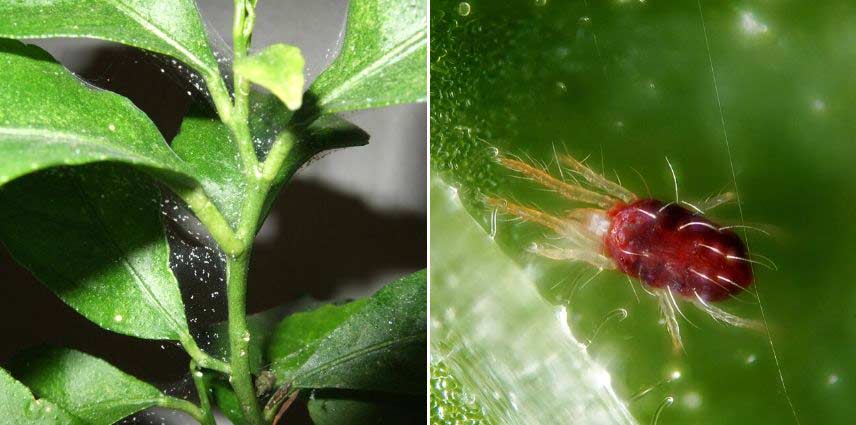 Les araignées rouges sont de minuscules acariens qui prélèvent la sève et tissent des toiles sur l’arbuste (photos : Paramecium / Gilles San Martin)