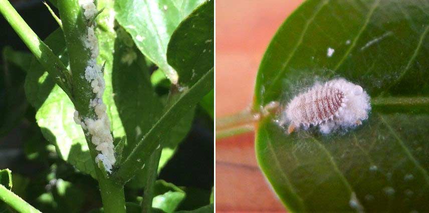 Les cochenilles sont de petits insectes qui piquent pour prélever la sève. Chez les agrumes, ce sont surtout les cochenilles farineuses qui posent problème (et notamment l’espèce Planococcus citri)