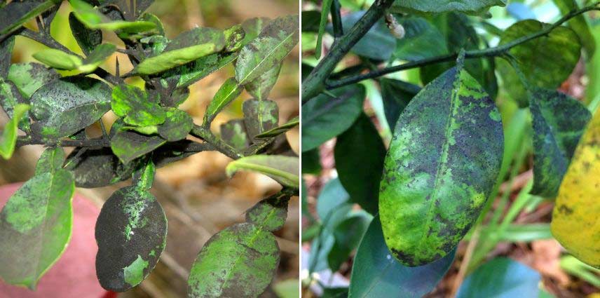 La fumagine se caractérise par un dépôt noir sur les feuilles, ce qui limite la photosynthèse (photos : Scot Nelson)