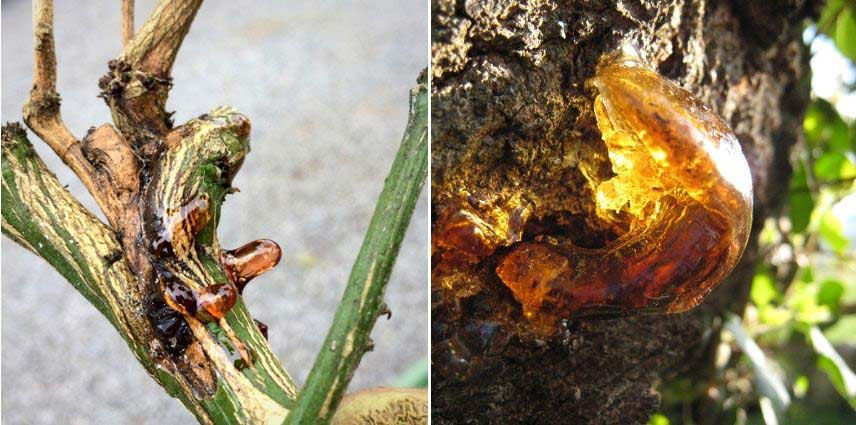 La gommose se traduit par l’écoulement d’une substance translucide sur le tronc ou les branches (photos : Scot Nelson / Malta)