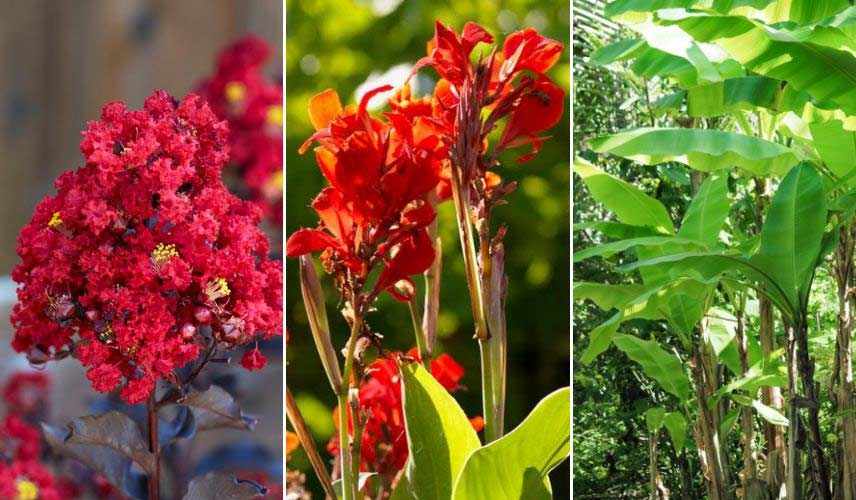 Les lagerstroemias dont les fleurs prennent une teinte plus prononcée : rose foncé ou rouge (par exemple, Lagerstroemia ‘Tuscarora’, ou ‘Black Solitaire Red Hot’…), s’intègrent facilement dans les massifs de style exotique. Mariez-les à la superbe floraison des bougainvilliers, qui prennent également des teintes vives, et que vous pourrez faire grimper contre la façade de votre maison. Intégrez également des phormiums, cordylines, et palmiers. Pensez au ricin, qui offre de grandes feuilles palmées, souvent pourprées. Vous pouvez également intégrer des fleurs telles que les agapanthes, crocosmias, cannas ou eucomis.
