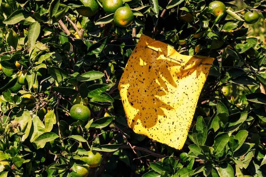 - Le piège chromatique englué jaune : les insectes volants, et plus particulièrement les mouches, sont attirés par le jaune. Ces pièges englués se montrent attractifs, les insectes s’y collent et ne peuvent plus s’échapper. Ces pièges permettent surtout de détecter la présence de la mouche méditerranéenne, mais, pour plus d’efficacité, il est conseillé de l’utiliser en lien avec les pièges à phéromones.