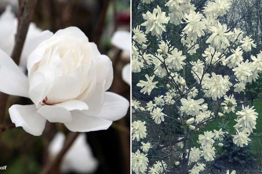 Le Magnolia stellata est un sublime petit arbuste, parfaitement adapté aux jardins de taille modeste, grâce à son envergure de 3 m en tous sens. Son port est étalé et ramifié. C’est l’une des variétés les plus précoces et florifères. Dès le mois de mars, il se couvre de délicates fleurs blanches aux pétales multiples, légèrement parfumées. Les fleurs du magnolia étoilé resteront de longues semaines, avant de laisser la place aux feuilles d’un vert foncé. À l’automne, le feuillage caduc du magnolia étoilé prendra des teintes dorées. Le Magnolia stellata se plait au soleil ou à la mi-ombre, dans un sol frais, drainé, au pH neutre voir acide, mais supporte difficilement le calcaire. Le magnolia étoilé endure parfaitement les gelées n’excédant pas les -25 °C.