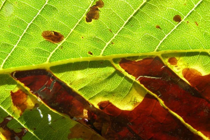C’est en effet à la présence de taches irrégulières rouges au contour jaunâtre sur le feuillage que la maladie se détecte. Les taches naissent d’abord sur le bord des feuilles. Au bout d’un certain temps, les feuilles se nécrosent et tombent.