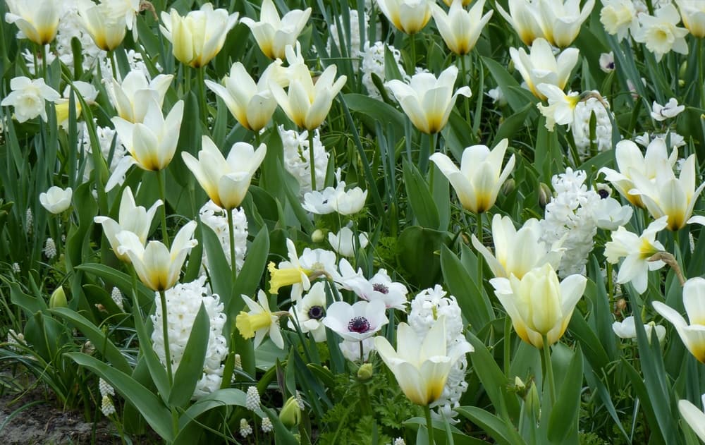 Créez une belle harmonie de couleurs en rassemblant uniquement des plantes dans les mêmes tons : pour une scène blanche, vous pouvez associer les narcisses ‘Mount Hood’ aux tulipes ‘Concerto’, aux jacinthes ‘Carnegie’, aux muscaris ‘White Magic et aux Anémones ‘The Bride’. Vous pouvez faire la même chose avec des fleurs jaunes.