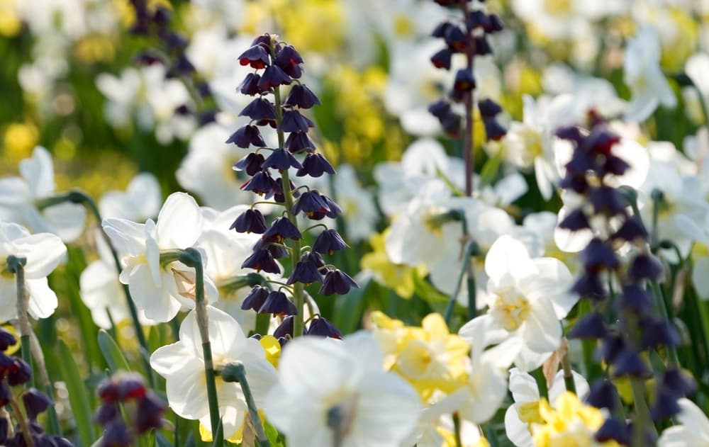 À l’inverse, osez les contrastes de couleurs. Mariez le jaune des narcisses avec le bleu des muscaris et Iris reticulata, pour faire ressortir toute l’intensité de ces couleurs ! Associez le jaune des narcisses ‘Peeping Jenny’ au mauve ou rose des Tulipes ‘Passionale’, Anemone coronaria ‘Double Amiral’ et Anemone blanda ‘Charmer’. Un autre exemple : utiliser la floraison claire de Narcissus ‘Step Forward’ pour mettre en valeur la teinte sombre de Fritillaria persica !
