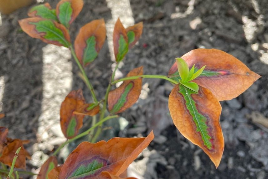 - Le feuillage ou les fruits brûlent et présentent une décoloration sombre ou plus claire
