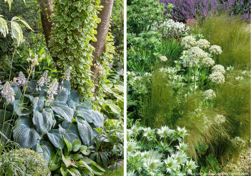 Ces deux massifs aux tonalités similaires ont des besoins différents : le premier appréciera un paillage qui retient l’humidité alors que le second appréciera un paillage minéral.