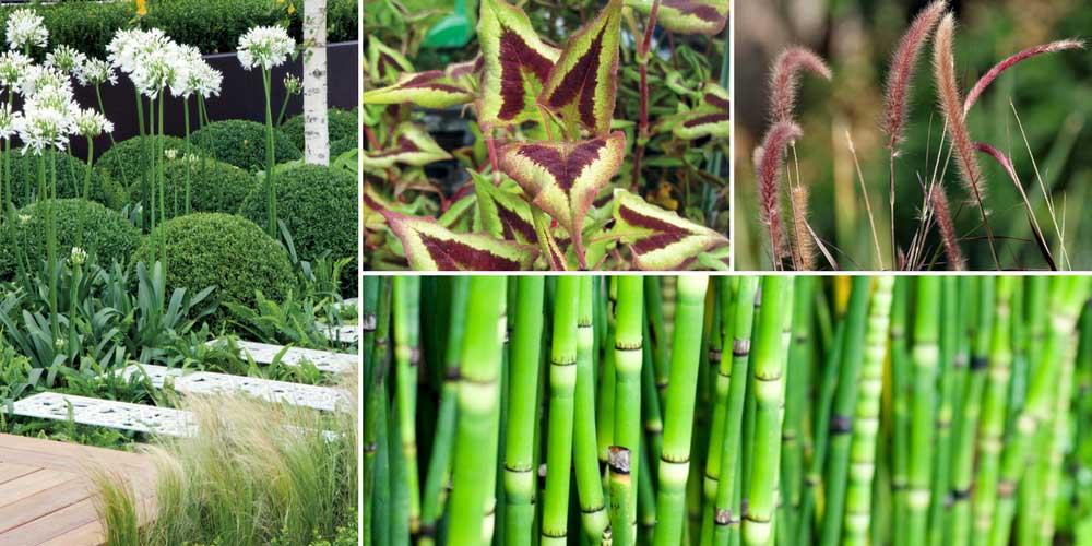 Créez un jardin contemporain, au design minimaliste et aux lignes géométriques. Installez quelques touffes de graminées (Stipa ou Miscanthus) accompagnées par des plantes graphiques et légères, comme le Gaura, la Verveine de Buenos Aires ou Persicaria bistorta. Placez quelques conifères ou buis taillés, pour structurer le massif. Et à leurs côtés, Persicaria runcinata ‘Purple Fantasy’ : son feuillage triangulaire aux tons chauds et contrastés sera du plus bel effet. Positionnez quelques grands pots plantés de bambous ou de prêles pour donner de la hauteur. Ajoutez des luminaires et du mobilier aux formes très épurées et géométriques.