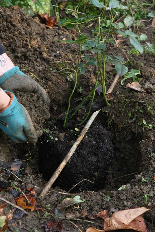 - Commencez à remettre la terre dans le trou tout en maintenant le rosier à la bonne hauteur, c’est-à-dire le point de greffe (bourrelet) légèrement au-dessus du bâton.