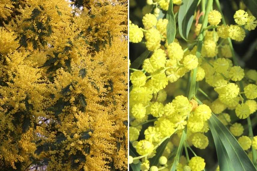 L’Acacia dealbata (à gauche) et l’Acacia retinodes ou des quatre saisons (à gauche) sont différemment rustiques