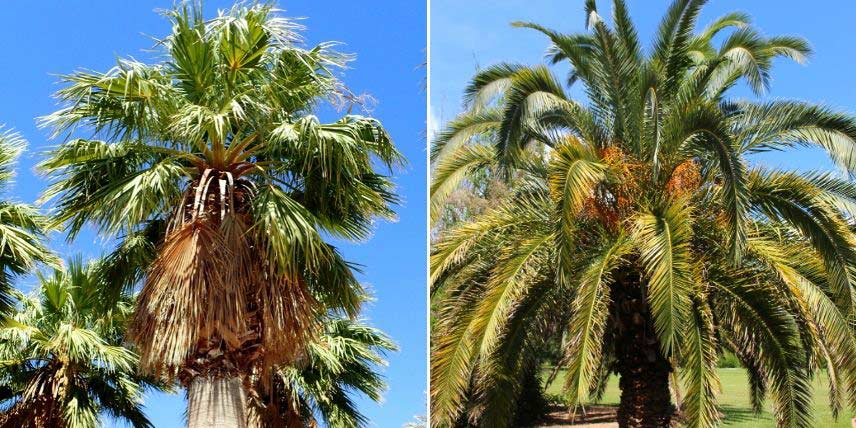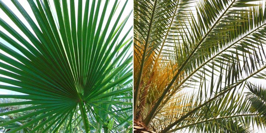 Les feuilles palmées d’un Washingtonia robusta, en éventail, et le feuillage penné d’un Phoenix, en forme de plumes.