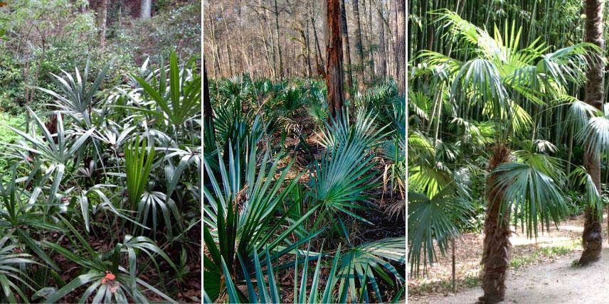 Trois palmiers qui s’adaptent bien aux situations ombragées : Rhapidophyllum hystrix (photo Homer Edward Price), Sabal minor (photo V.B. Williamson) et Trachycarpus fortunei (photo Georges Seguin)