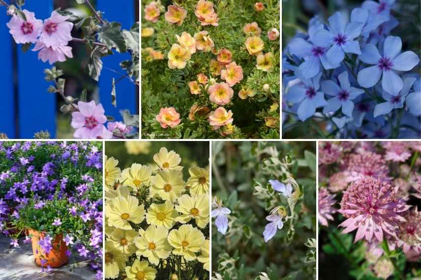 Nos préférés : Potentilla fruticosa ‘Double Punch Peach’, Phlox ‘Chattahoochee’, Lavatera maritima, Benoite ‘Mai Tai’, Cosmos ‘Xanthos’, Delphinium Highlander ‘Sweet Sensation’